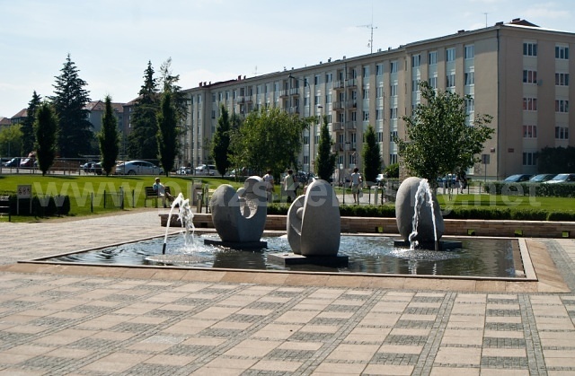 Počátkem roku 2010 byla před budovou ředitelství PRE instalována poměrně rozměrná fontána. Čtvercový bazén zdobí tři kamenné objekty, které jsou dílem sochaře Michala Moravce. Tyto objekty představují rozkvetlé kamenné květiny. V jednotlivých květech jsou nasazeny kovové tyče s malými žulovými koulemi s nimiž se dá pohybovat. Sochy byly vytvořeny z francouzské leštěné žuly Tarn a každá váží asi 1,5 tuny. Bazén je osazen čtyřmi kovovými vysutými tryskami a čtyřmi podvodními. Fontána má noční osvětlení.