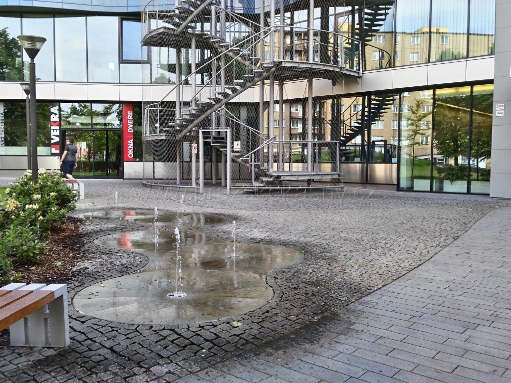 V zadním traktu budovy, poblíž hlavního vstupu, vzniklo malé posezení s pochozí fontánou. Tu tvoří pět vodotrysků zapuštěných do úrovně dlažby chodníku. Každý vodotrysk je opatřen osvětlením.