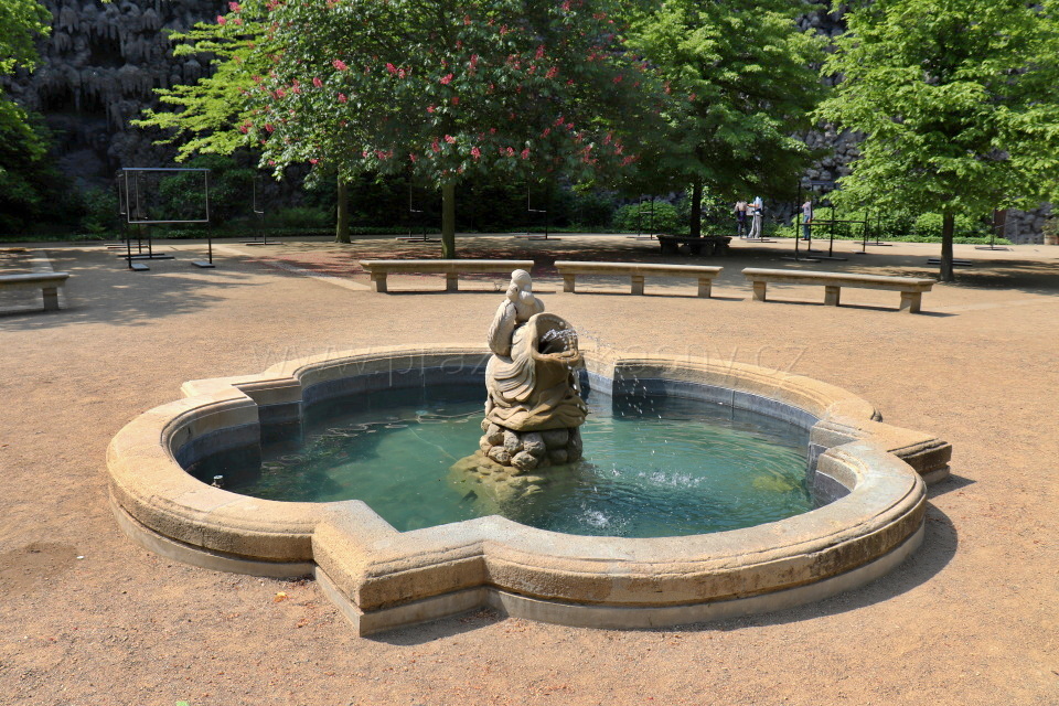 Opět fontána, o které jsem zatím nenašel žádné informace. Jedná se o pískovcovou fontánu s plastikou ryby jako chrlič. Nachází se před umělou jeskyní v zahradě.