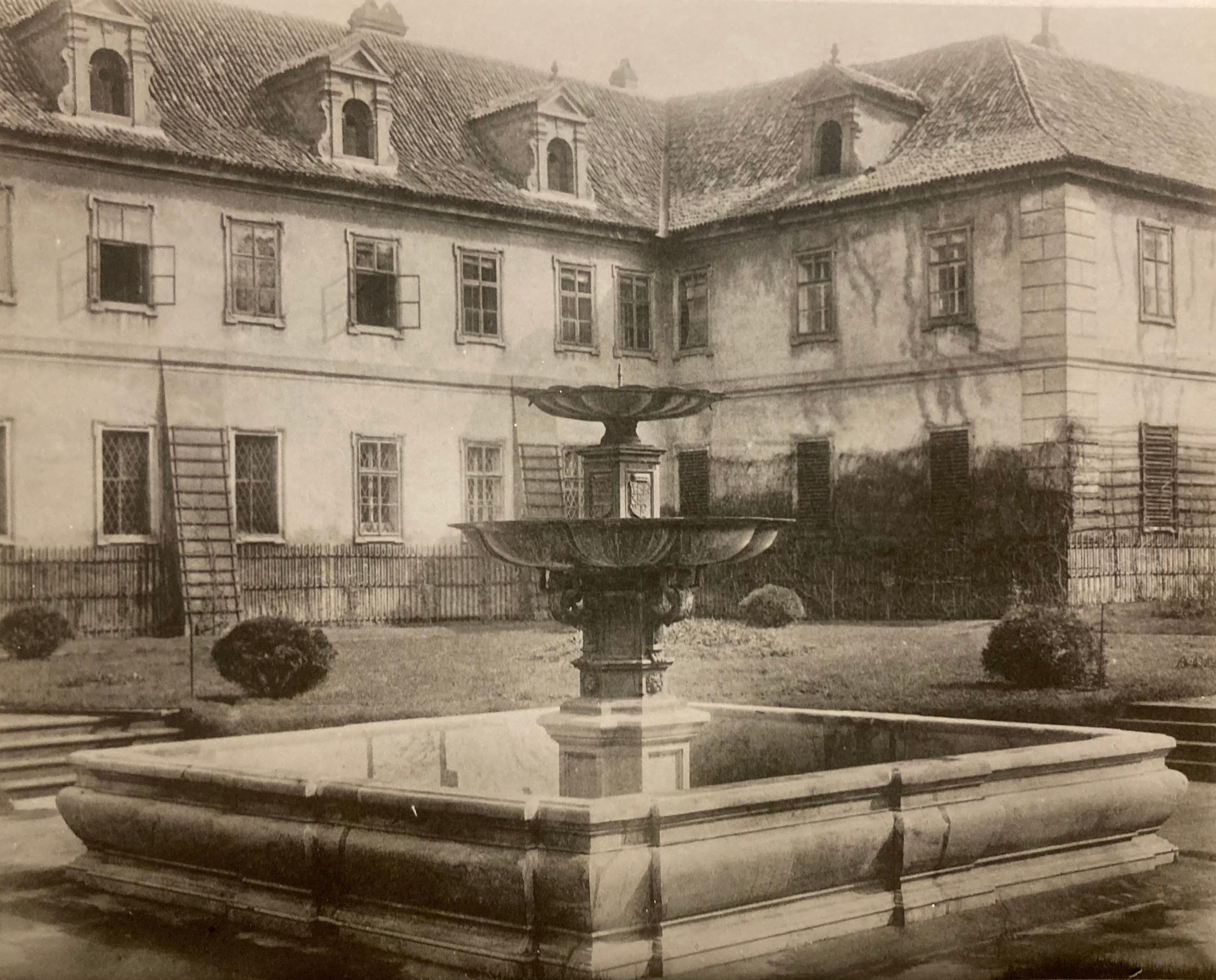 Kašna s Venuší bývala součástí renesanční zahrady nejvyššího hofmistra Kryštofa Popela z Lobkovic, který si umělecké dílo objednal v roce 1599 do svého někdejšího hradčanského paláce, na jehož místě je dnes palác Šternberský. Autorem bronzové plastiky je norimberský sochař a kovolitec Benedikt Wurzelbauer. Od Lobkoviců získal plastiku pro svou zahradu pražského paláce v roce 1630 slavný válečník Albrecht z Valdštejna. V posledním roce třicetileté války odvezli sousoší švédští vojáci. Poté bylo těleso kašny, někdy po roce 1642, ze zahrady odvezeno na zámek v Duchcově. Ten se po sňatku hraběnky Polyxeny z Lobkovic s Maxmiliánem z Valdštejna stal majetkem právě rodu Valdštejnů. Kašna zde zůstala umístěna na čestném dvoře až do počátku 20.století. Pravděpodobně v roce 1910 bylo těleso kašny odvezeno zpět do Valdštejnské zahrady. Na konci 19. století se také vrátilo vzácné dílo - plastika - zpátky do Čech a v roce 1889 v dražbě získalo originál Uměleckoprůmyslové muzeum. Je vystaven v Obrazárně Pražského hradu. Replika originálu plastiky vznikla v roce 1938 v souvislosti s výstavou Pražské baroko a je opět, i když na jiném místě, umístěna na fontáně ve Valdštejnské zahradě. Historická fotografie, kterou mi poskytl kastelán zámku Duchcov pan Petr Horák, zobrazuje kašnu na nádvoří zámku. Pochází někdy z počátku 20. století.
