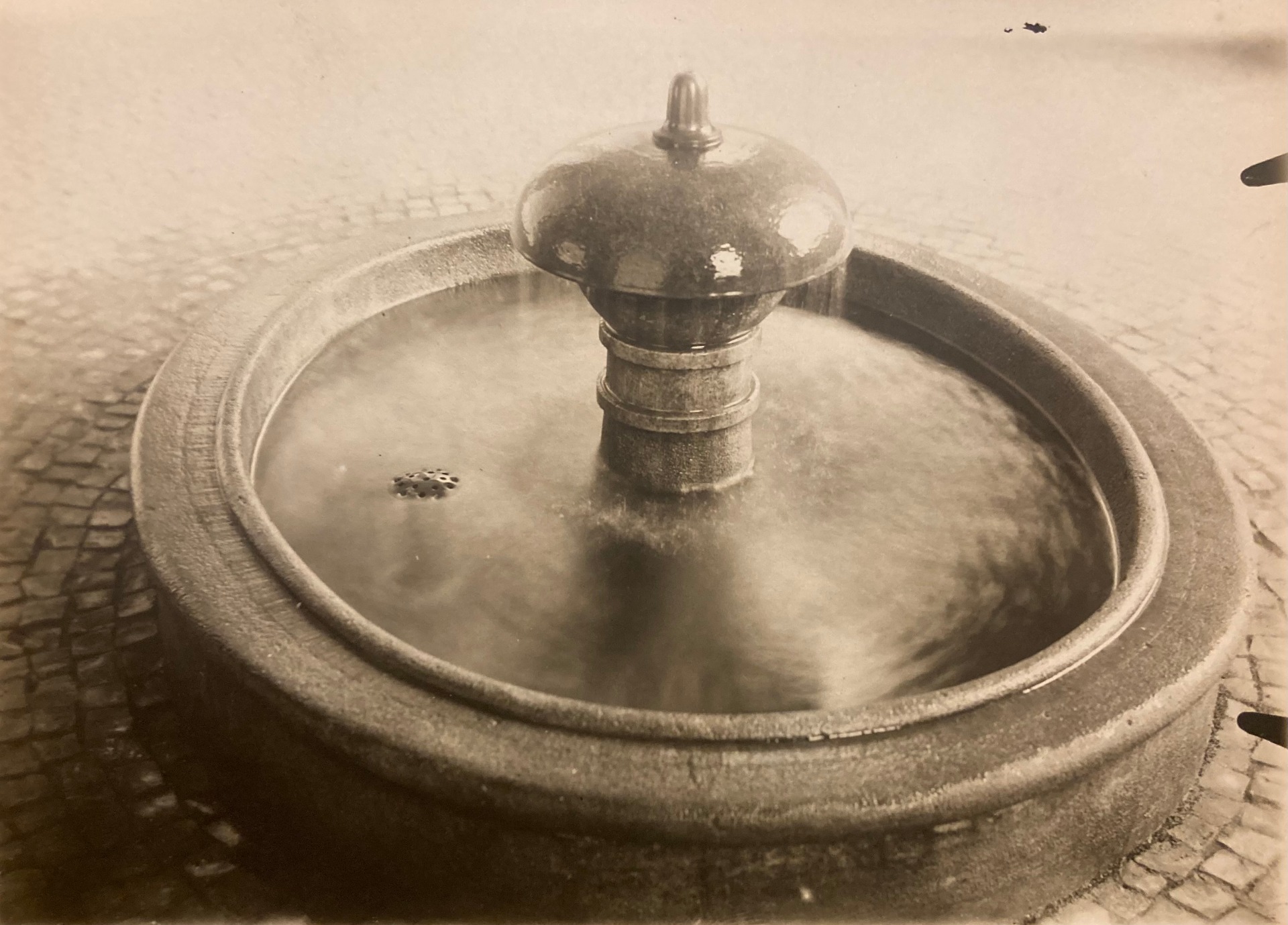oválná fontánka je zasazena v žulové dlažbě. Z mělkého bazénku vystupuje