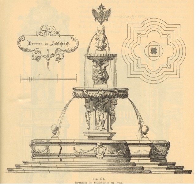 Kašna byla vydávána za dílo Arnošta Heidelbergera z roku 1686, avšak stavební archivář Jan Herain objevil na Vulkanově figuře písmena H.K., tedy Hieronymus (Jeronym) Kohl. Svůj podíl na kašně má také italský kameník Francesco della Torre. Kašna je nazývána podle svého tvůrce, ale také Lví, podle plastik na sloupu, nebo Leopoldova podle císaře, neboť vznikala za jeho vlády. Tři kamenné stupně nesou spodní nádrž, která je zdobena festony, lvími hlavami, maskarony a kartušemi s císařským monogramem "L" (Leopold I.). Také horní nádrž je bohatě zdobena. Dolejší nádrž podpírají postavy antických bohů Merkura, Vulkána, Neptuna a Herkula, horní nesou dva Tritoni. Vrchol je zakončen koulí, kterou vzpírají tři lvi. Na kouli bývala ještě Habsburská orlice, byla ale odstraněna po roce 1918. Zdrojem vody pro kašnu je prastarý hradní vodovod, který získává vodu z Brusnice a z rybníka pod letohrádkem Hvězdou z Liboce. Kašna je vytesána z žehrovického pískovce.
