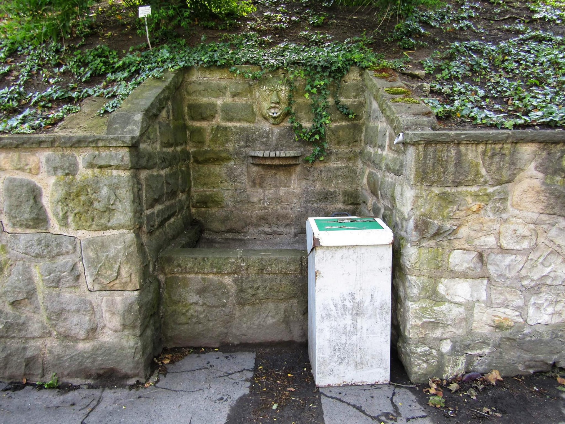 Naproti zadní straně budovy katedry botaniky se ve výklenku opěrní zídky nachází menší nádrž na vodu. Nad obdélnou pískovcovou nádrží je ze zdi vyveden chrlič ve tvaru hlavy Fauna. Voda z kašny je pitná. V současné době je kašna mimo provoz.